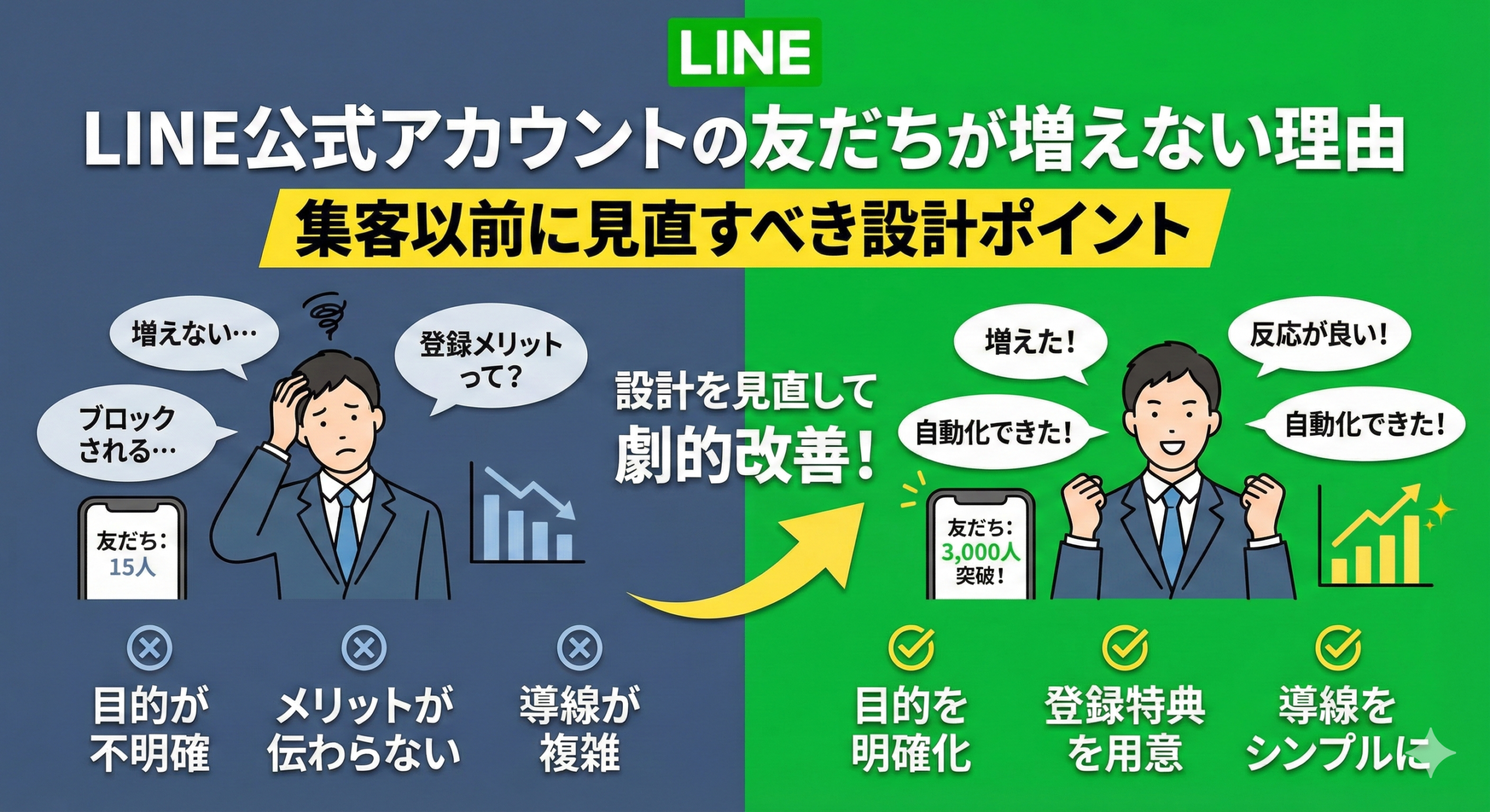 LINE公式アカウントの友だちが増えない問題は、集客施策の不足ではなく、登録の意思決定を支える設計が整っていないことから起きる場合が多いです。