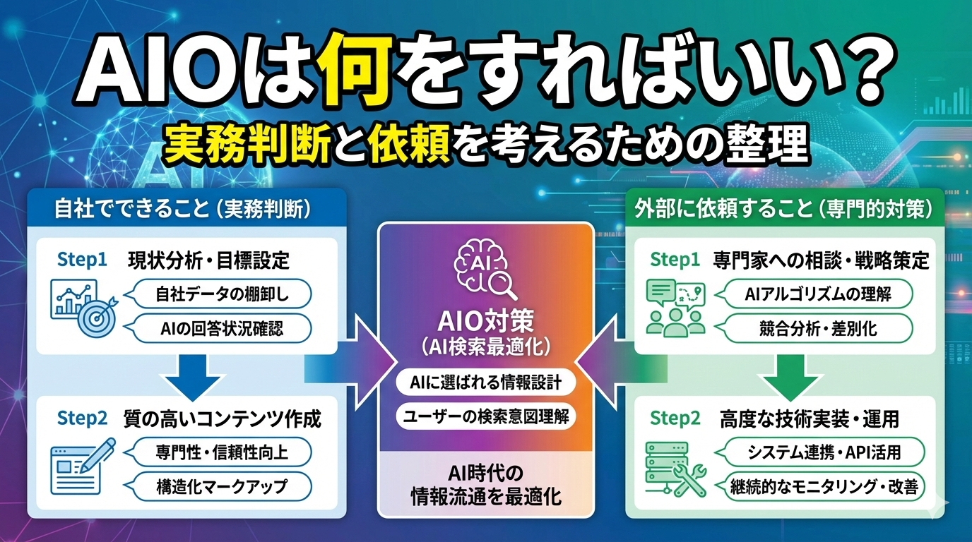 AIOは、AI検索や生成AIの回答に取り上げられるための『新施策』というより、企業の一次情報を誤解なく伝えるための情報設計の問題として整理すると、実務判断がしやすくなります。