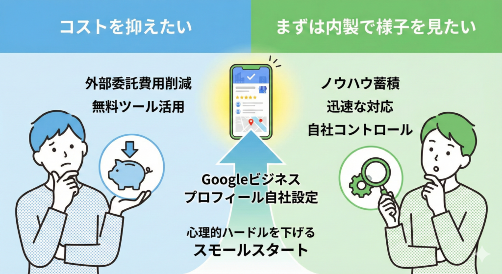 外部委託は固定費になりやすく、まずはコストを抑えて試したいという判断は自然です。