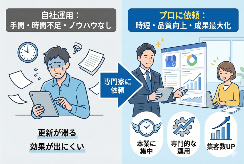 Googleビジネスプロフィールの代行は、忙しさの解消だけでなく、運用に必要な判断・分析・検証の一部を外部に委ねる選択肢として捉えると、過不足のない意思決定ができます。