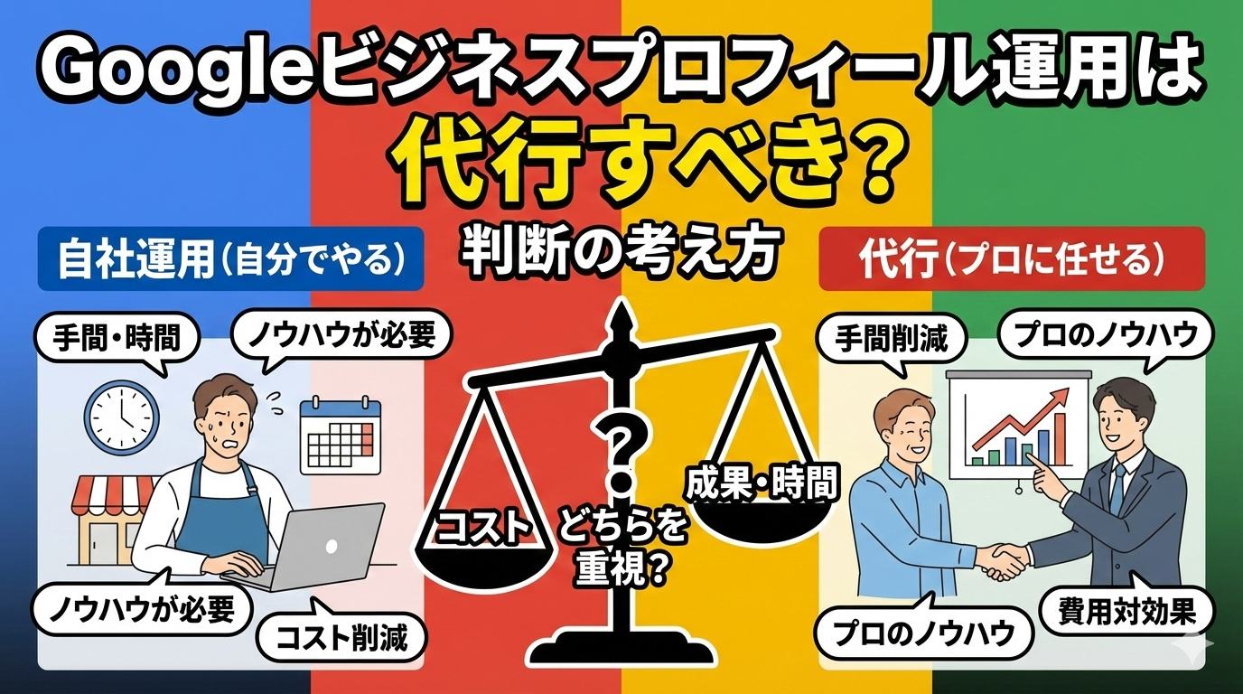 Googleビジネスプロフィール(GBP)の運用を「自社で続けるべきか、代行に任せるべきか」で迷う中小事業者向けに、判断軸を整理する記事です。