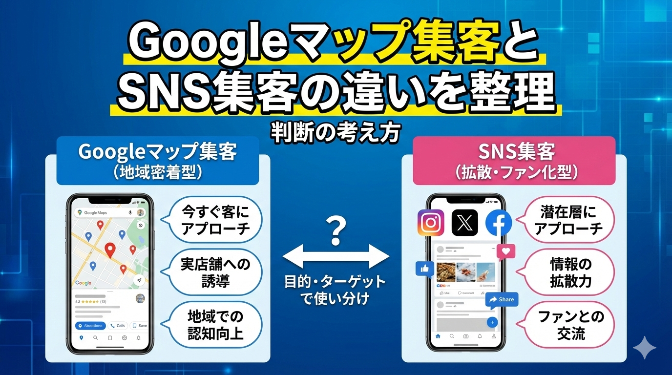 Googleマップ集客とSNS集客は、同じ『集客』でも担う役割が異なります。