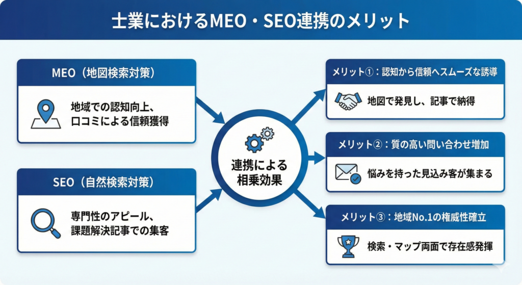 SEOは中長期で指名検索や専門テーマの流入を作り、MEOは地域検索の入口を押さえる、という分担が考えられます。