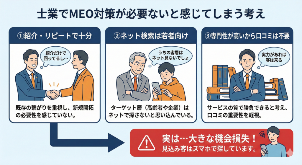 士業の集客は「比較検討」と「信頼形成」の比重が大きく、一般業種のMEOの考え方をそのまま当てはめると判断を誤りやすい点があります。