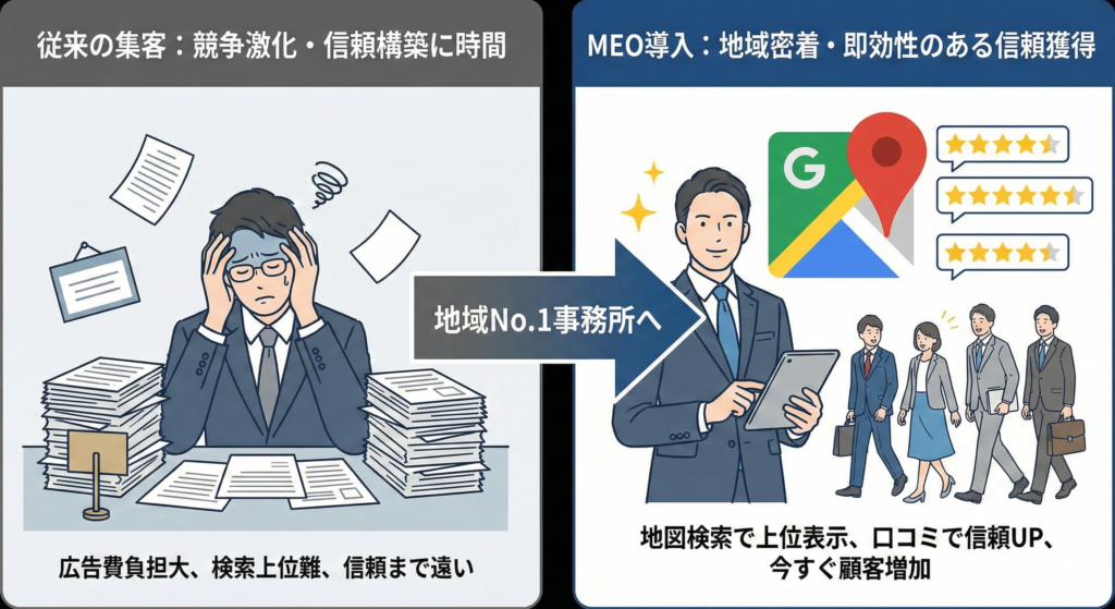 MEOの役割は、士業においては「地図で上位表示を取ること」そのものより、比較検討の初期段階で『候補として落とされない状態』を作ることにあります。