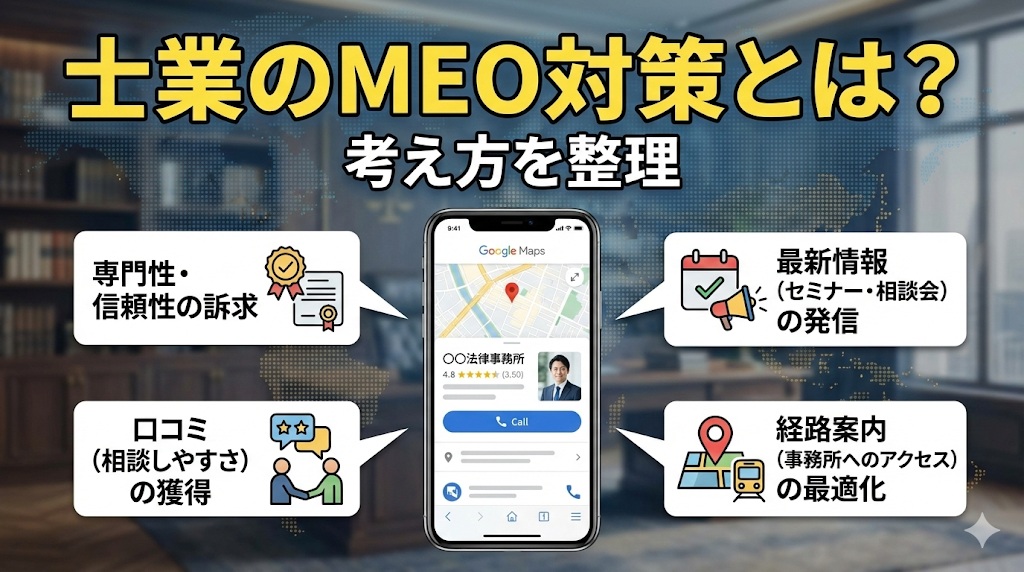 士業のMEO対策は、地図で目立つこと自体が目的ではなく、比較検討の入口で『信頼を損なわない情報』を揃え、適切な相談につなげるための整備と捉えるのが安全です。