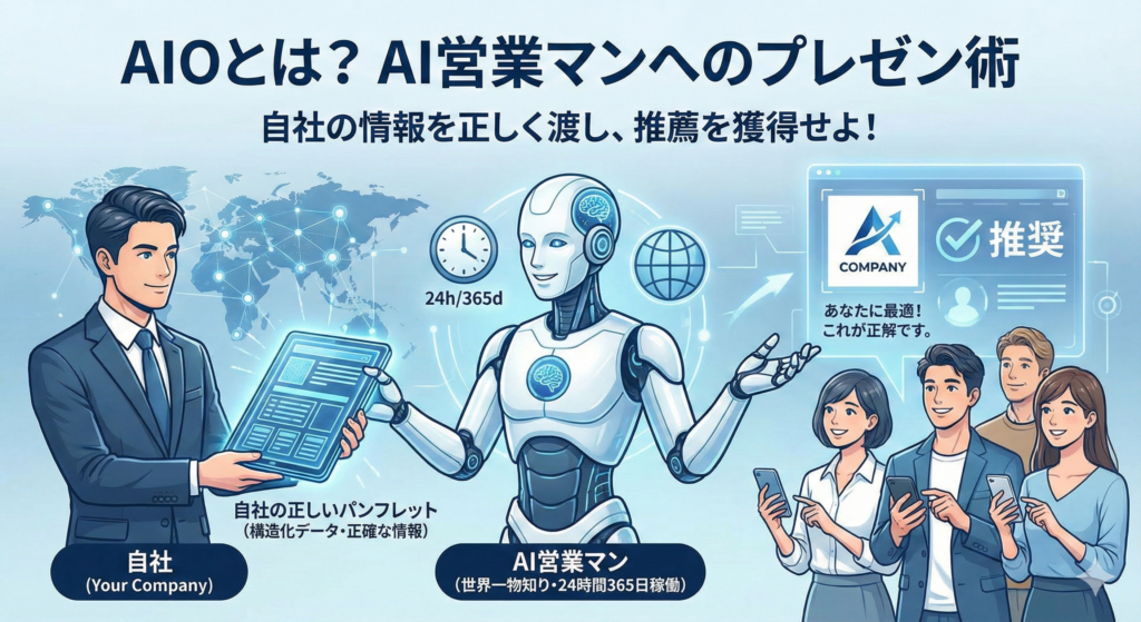 経営者の視点で言えば、AIOとは「AIという、24時間365日働く『世界一物知りな営業マン』に、自社のパンフレットを正しく手渡し、推薦してもらうためのプレゼン術」だと考えてください。