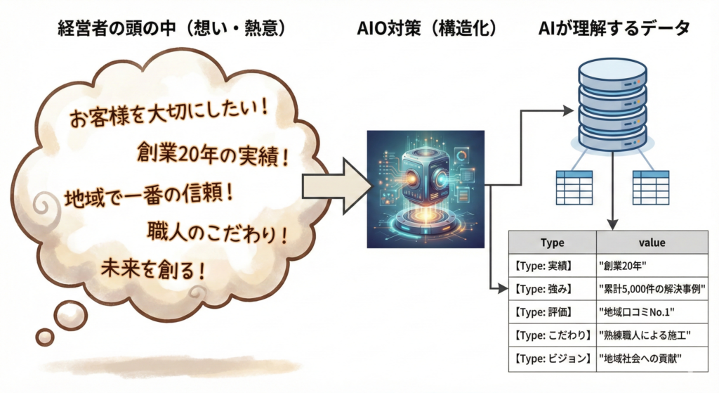 AIはただ、ネット上に散らばる膨大なデータの中から、あなたの会社の「誠実さ」「専門性」「評判」というデジタルな口コミを拾い上げ、困っているユーザーに届けているに過ぎません。