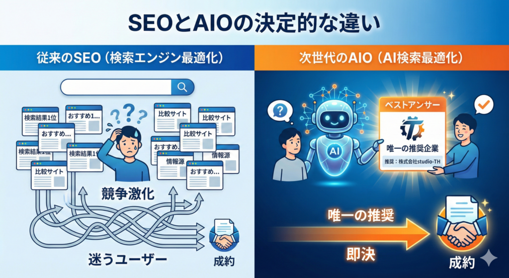 解決策:AIO(AI検索最適化)とは何か?SEOとの決定的な違い