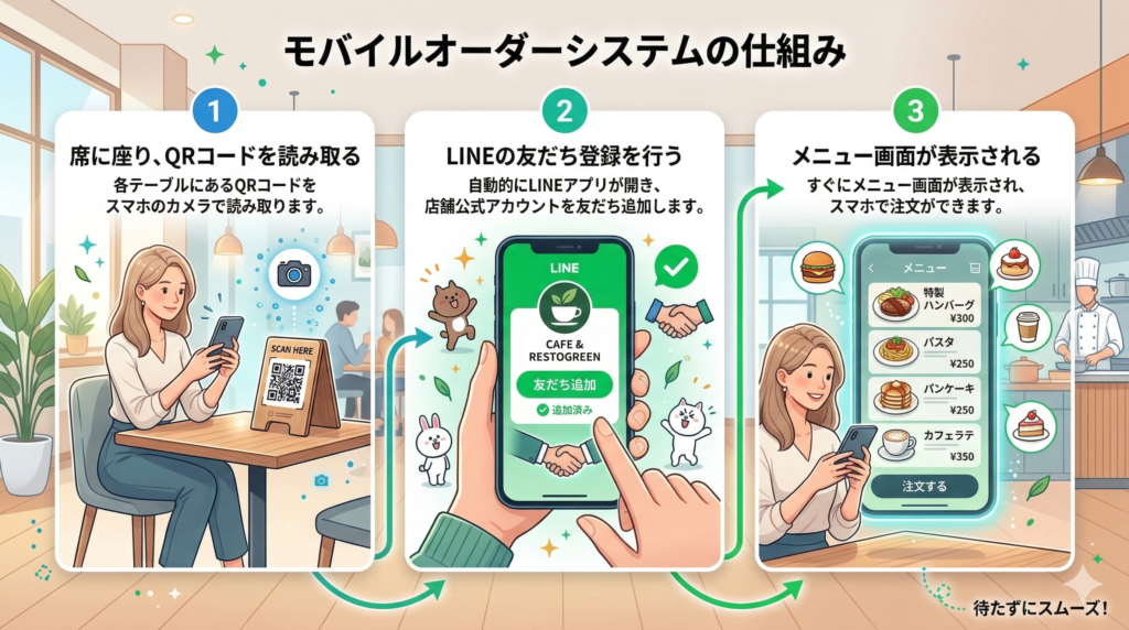 LINEオーダーシステムの基本は、テーブルや店頭のQRコードを読み取り、LINE上(またはLINEミニアプリ/連携Web)でメニューを見て注文する仕組みです。