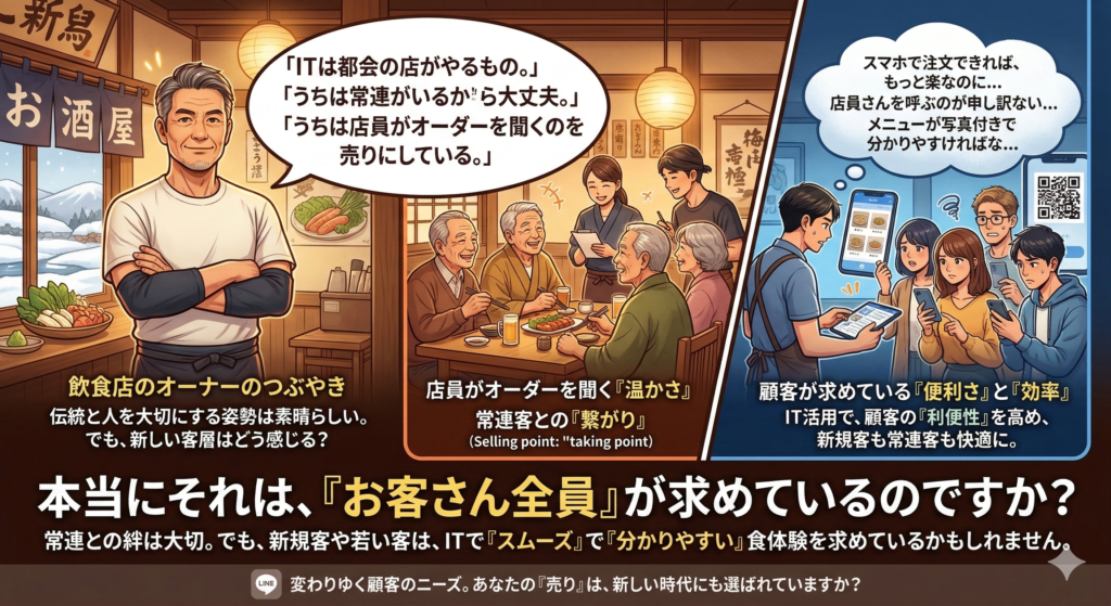 地方の飲食店では、「ITは都会の店がやるもの」「うちは常連がいるから大丈夫」「うちは店員がオーダーを聞くのを売りにしている」という声をよく聞きます。