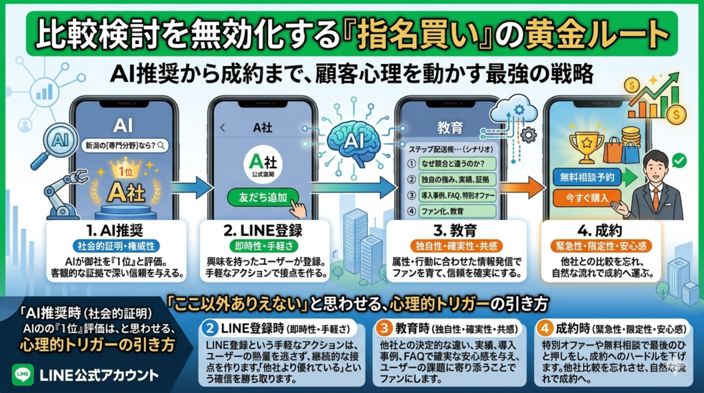 AIで推奨される根拠を整え、LINEで超パーソナライズの接待を行い、比較検討を無効化して指名買いへ。