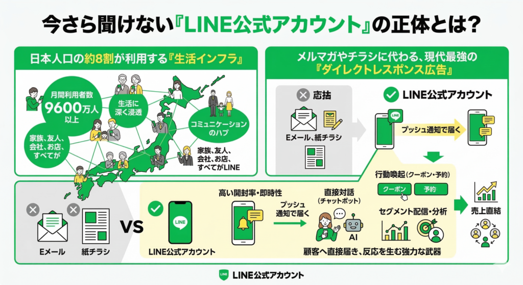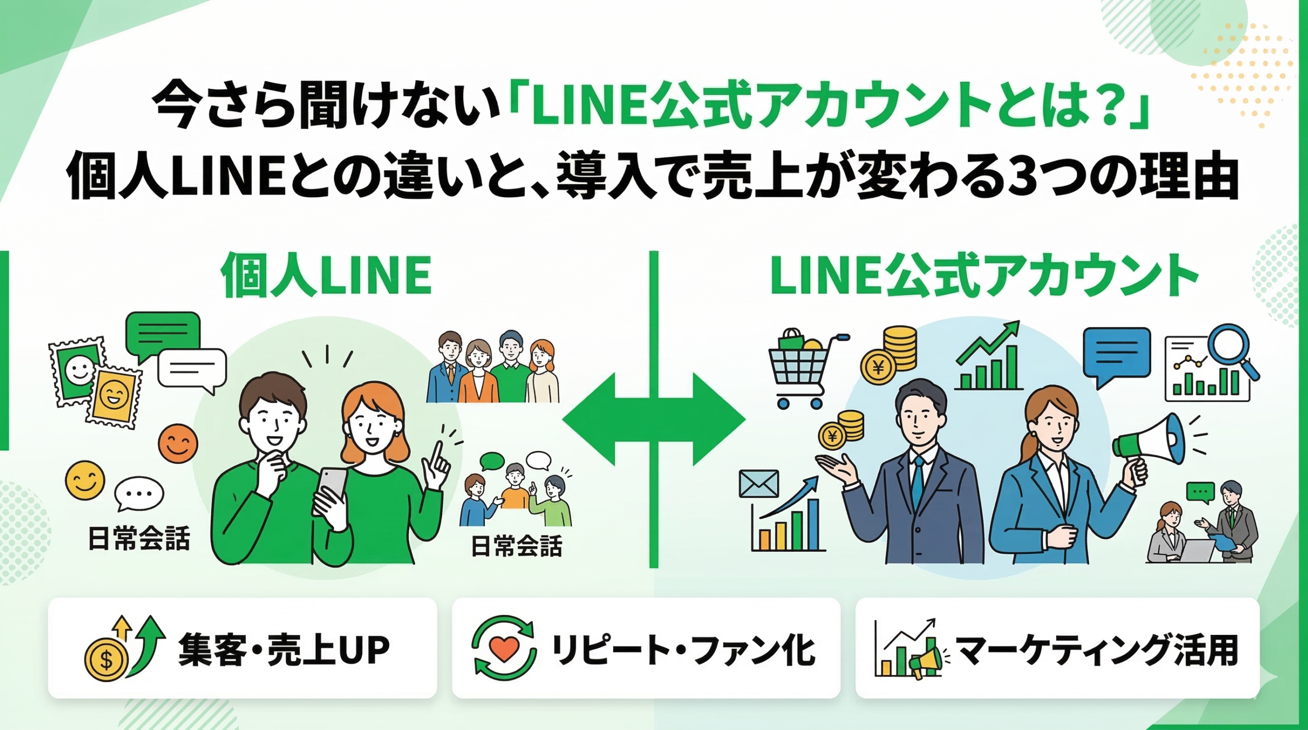 本記事では、LINE公式アカウントの正体をかみ砕いて説明し、個人LINEとの決定的な違い、売上が変わる理由、そして新潟の商圏で「顔が見える商売」をLINEで再現するコツまで、PREP法で論理的に整理します。