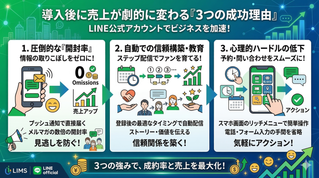 LINE公式アカウントで売上が伸びる会社には共通点があり、それは「見てもらえる」「信頼が積み上がる」「行動が簡単」の3点を仕組みにしていることです。