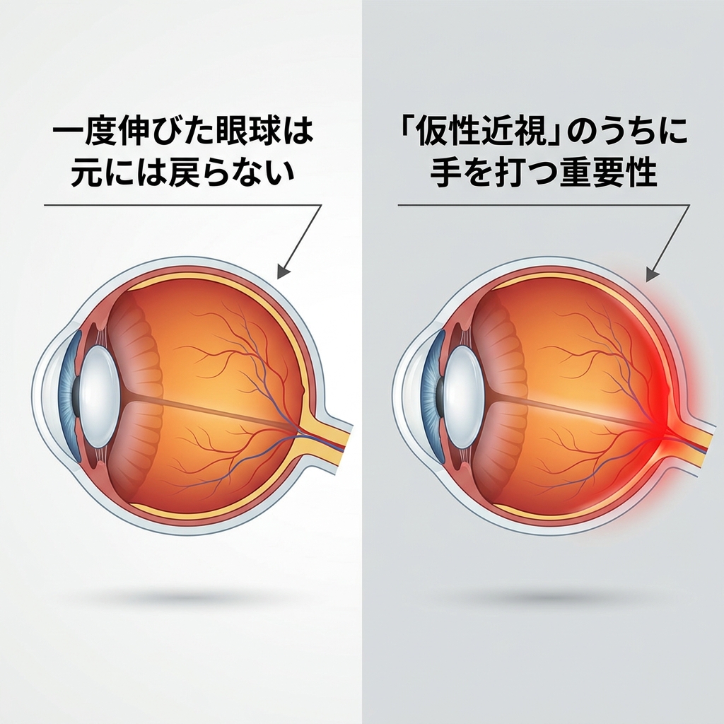 この「いたちごっこ」を繰り返すうちに、本来なら防げたはずの軸性近視(眼球の変形)まで一気に進んでしまうのです。