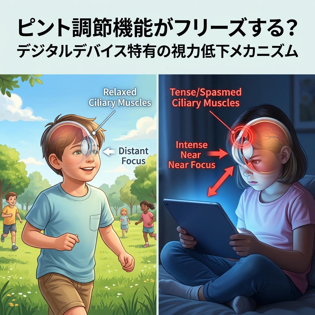 紙の読書であれば、ページをめくる際や顔を上げる際に無意識にピントを外す瞬間がありますが、ゲームや学習ソフトは「没入感」が高いため、数十分、あるいは1時間以上もの間、ピントが一点にフリーズした状態になります。