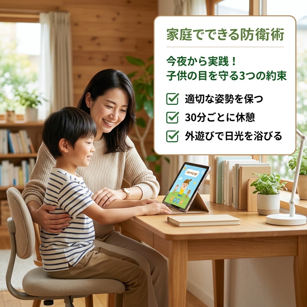 トレーニングを始める・始めないに関わらず、現代のデジタル環境下でお子様の視力を守るためには、家庭内での「視力防衛術」を徹底することが不可欠です。