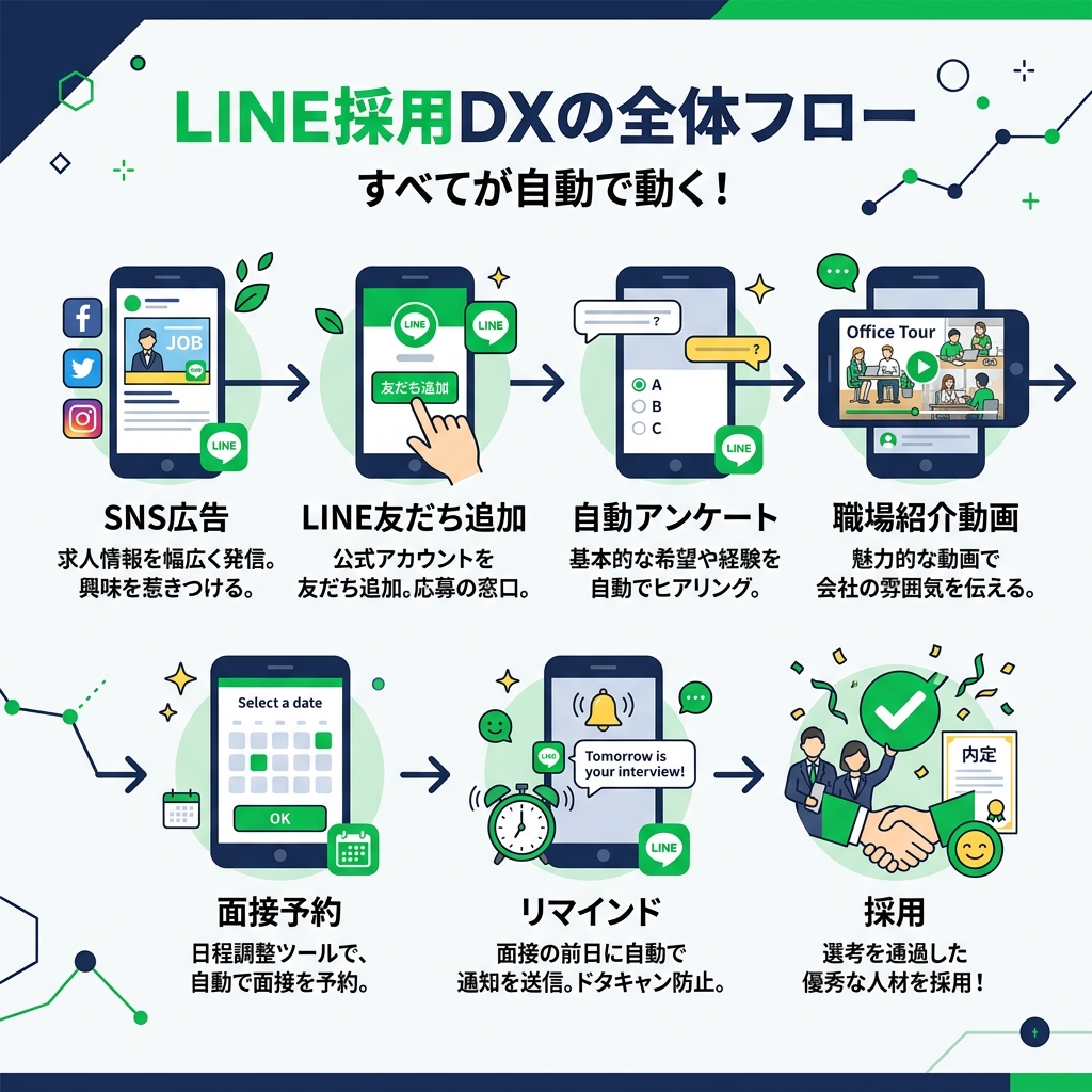 LINE公式アカウントとLステップを活用した「採用DX」の最大のメリットは、応募者との接点が生まれた瞬間から面接、さらには入社後のフォローに至るまで、すべてのコミュニケーションを自動化・仕組み化できる点にあります。