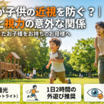 寝る前の暗い部屋で、光っている画面はありませんか? 「もう寝る時間だよ!」と声をかけたのに、お子さまが布団の中でスマホやタブレットの画面を見ている――。 そんな光景に心当たりはありませんか? 実はこの… 続きを読む: 暗い部屋でスマホはNG!|子供の目を守る「照明と距離」の正しい知識 - 外遊びが子供の近視を防ぐ?|太陽光と視力の意外な関係